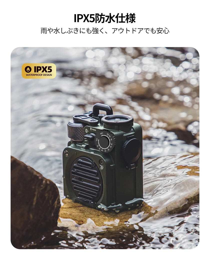 IPX5相当の耐水性能で、キャンプ・BBQ・釣りなど、さまざまなアウトドアシーンで大活躍します。