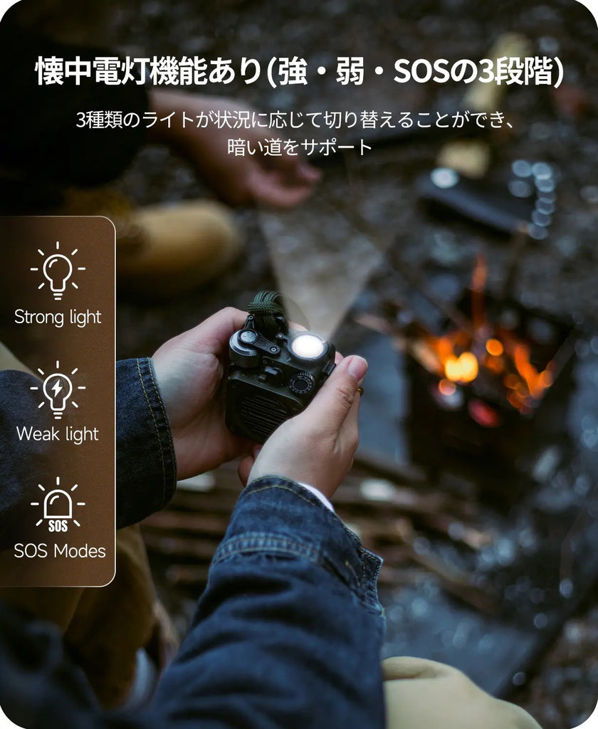 夜間の使用や災害時のSOS発信にも使える実用的なライトです。