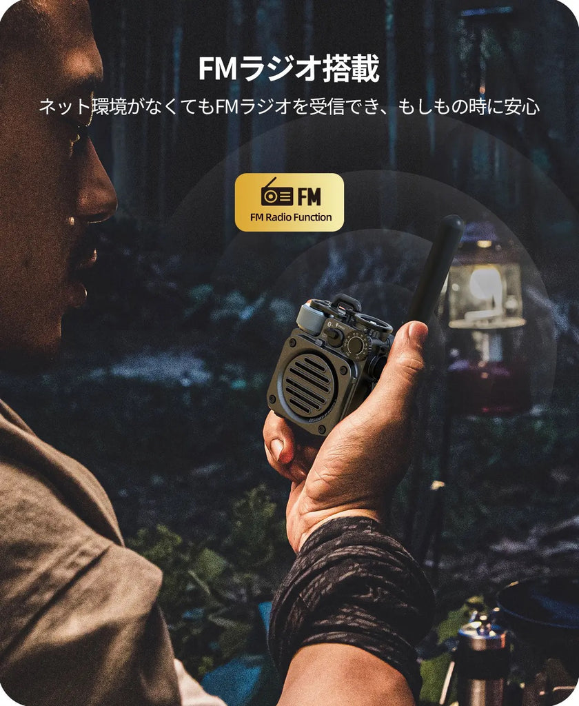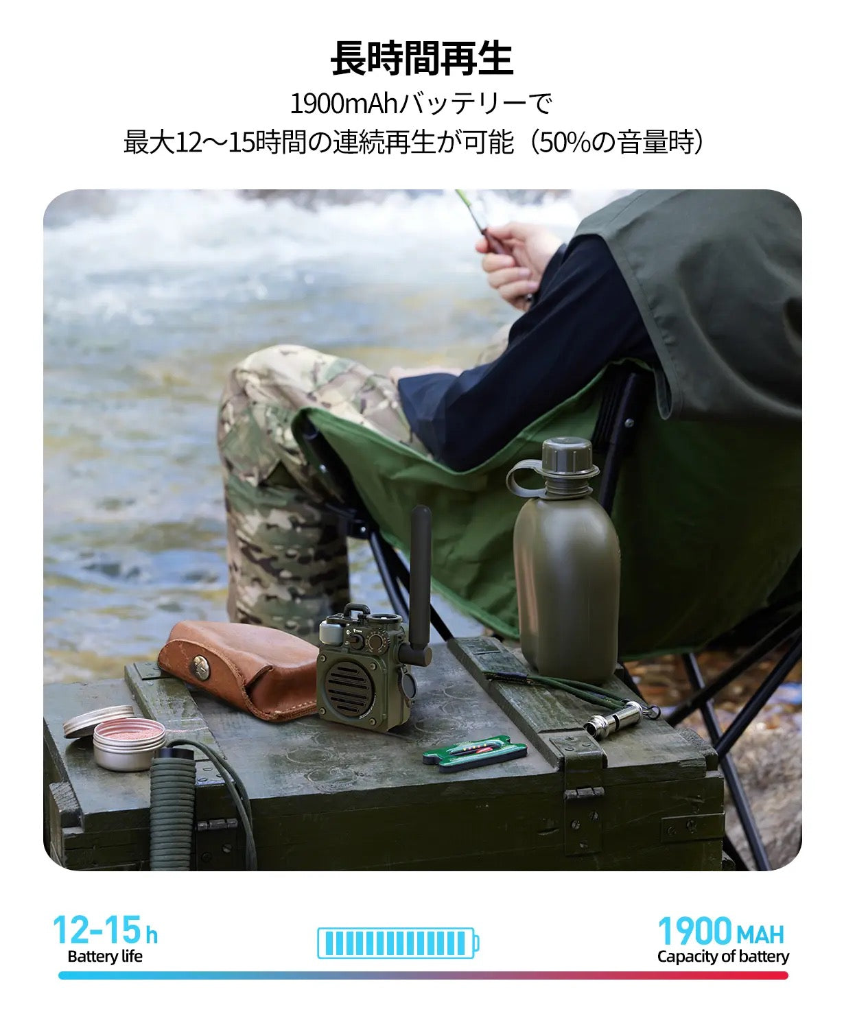 音楽再生はもちろん、LEDライトやFMラジオ使用時も安心の持続力です。