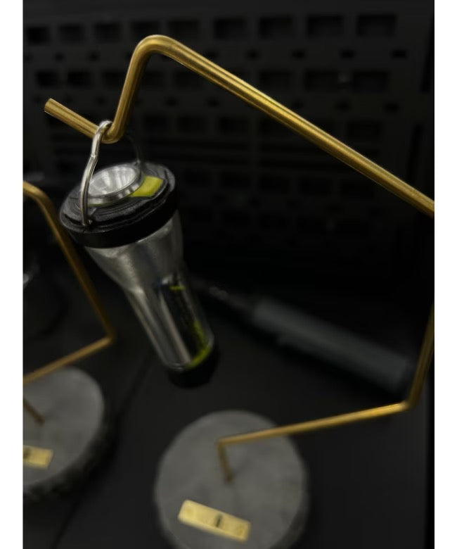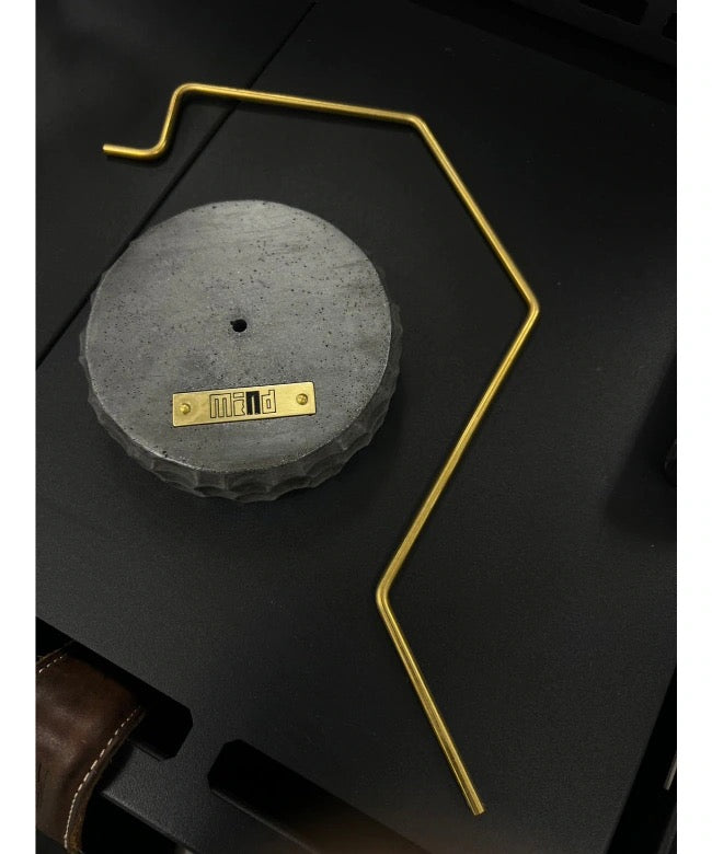 ナグリ模様のモルタル土台+真鍮のアクセント モルタルならではの重厚感がありながら、直径10cmのコンパクトサイズで、デスクやテーブル上でも安定感を発揮します。