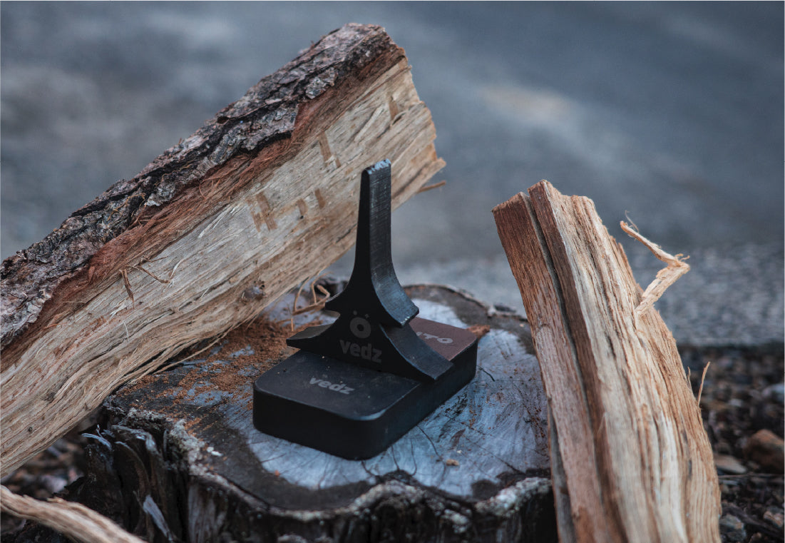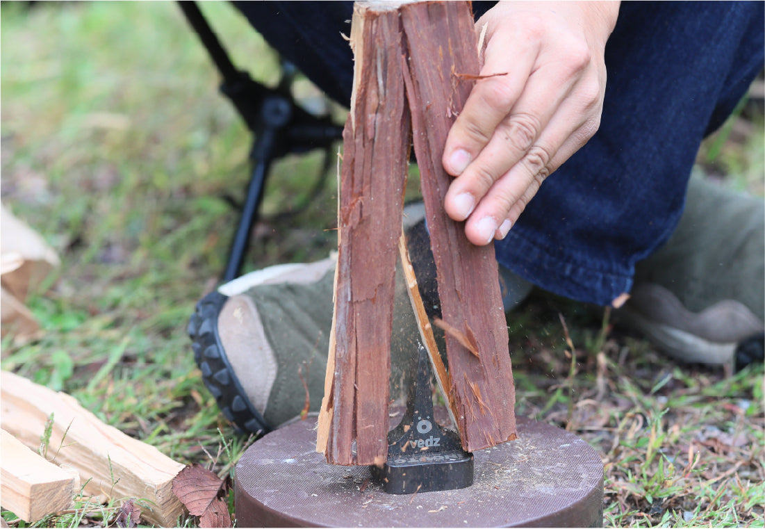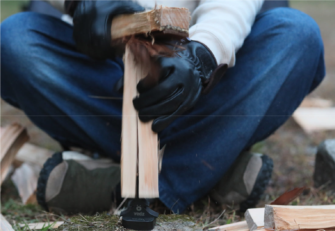 vedzは、荷物を少しでも減らしたい方にとってのネックになるハンマーがなくても、薪で叩けばしっかり割ることが出来ます。
