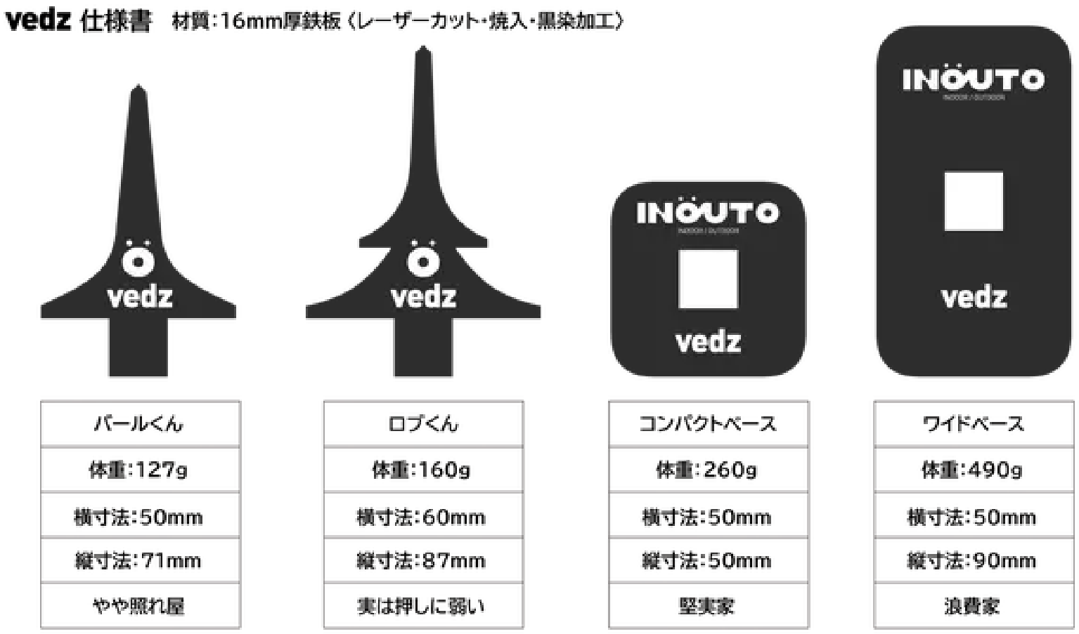 vedzは黒染め加工をしておりますので、耐食性に優れていますが、使用により黒染め加工がはがれる個所がございます。そのままにしておくと、錆が出ることがありますので、使用後、汚れをふき取り、乾燥させ、必ず濡れない所に置いておいてください。
